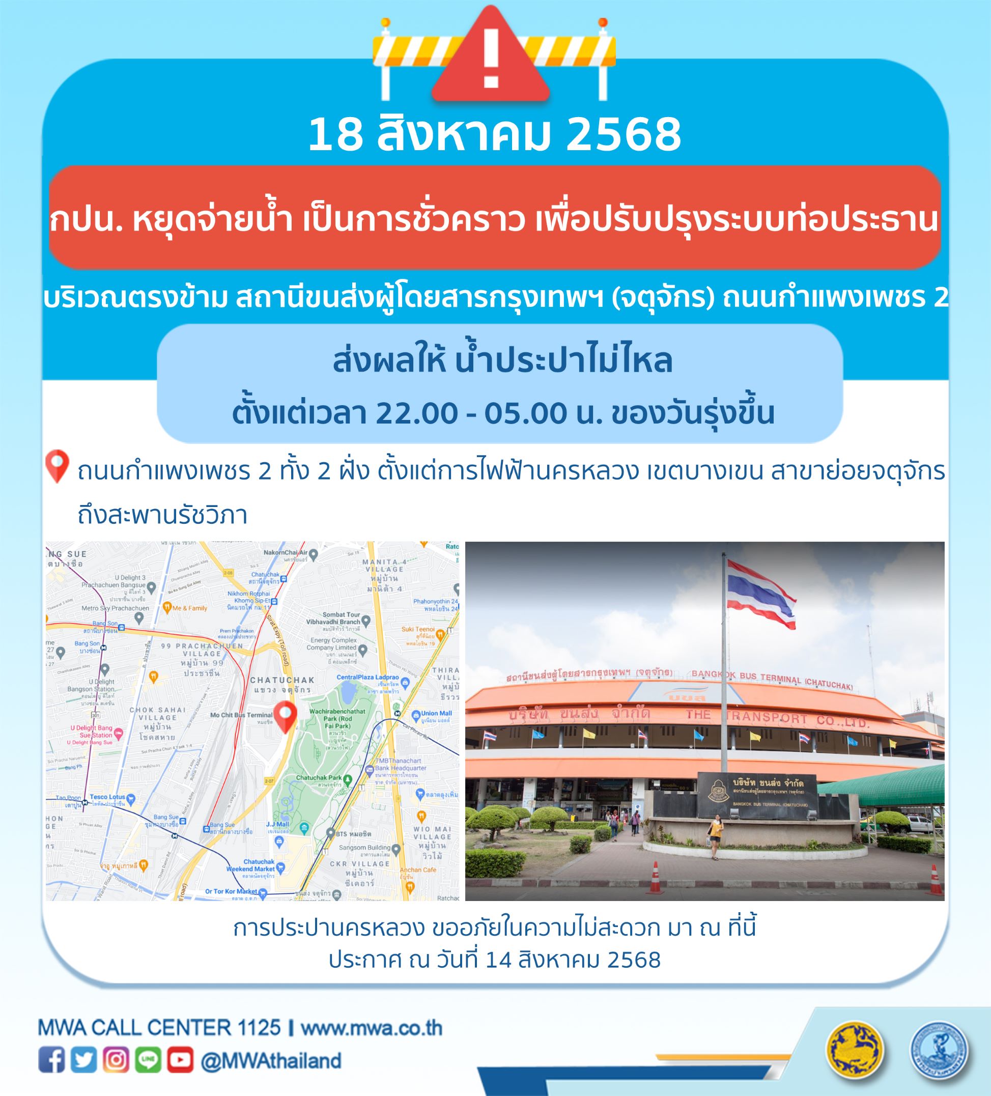 การประปานครหลวง (กปน.) ขอแจ้งให้ทราบว่า จะดำเนินการปรับปรุงระบบท่อประธาน ในพื้นที่บริเวณตรงข้าม สถานีขนส่งผู้โดยสารกรุงเทพฯ (จตุจักร) ถนนกำแพงเพชร 2 เพื่อให้ประชาชนได้รับบริการน้ำประปาอย่างเพียงพอและทั่วถึง จึงมีความจำเป็นต้องหยุดจ่ายน้ำ เป็นการชั่วคราว ในคืนวันจันทร์ที่ 18 สิงหาคม 2568 ตั้งแต่เวลา 22.00 - 05.00 น. ของวันรุ่งขึ้น โดยระหว่างดำเนินการ ส่งผลให้ น้ำประปาไม่ไหล ในพื้นที่ดังต่อไปนี้