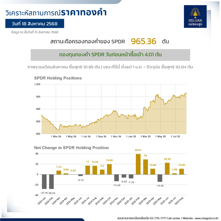 ราคาทองคำอยู่ในช่วงของการปรับฐานทรงตัว ท่ามกลางตัวเลขเศรษฐกิจที่สำคัญของสหรัฐฯในวันศุกร์ ได้แก่ Core Retail Sales m/m ออกมาตามที่คาดการณ์ ขณะที่ Retail Sales m/m และ Prelim UoM Consumer Sentiment ออกมาลดลงจากที่คาดการณ์ ขณะที่ Empire State Manufacturing Index ออกมาสูงขึ้นจากที่คาดการณ์ ซึ่งบ่งชี้ได้ว่า ตัวเลขเศรษฐกิจของสหรัฐฯยังคงอ่อนแอ โดยเฉพาะในภาคค้าปลีก ทำให้ราคาทองคำหลุดจากระดับ 3,400 เหรียญลงมาอยู่ระหว่าง 3,330 - 3,350 เหรียญ เรียกได้ว่าราคาทองคำกลับมาสร้างฐานใหม่ที่สูงขึ้นเล็กน้อยจากฐานเดิมที่ระดับ 3,300 เหรียญ ซึ่งเป็นจุดต่ำสุดเดิม ขณะที่ดัชนีดอลลาร์ปรับตัวลดลงเล็กน้อยจากเมื่อวันศุกร์เปิดที่ระดับ 98.18 จุด ขณะที่เช้านี้อยู่ที่ระดับ 97.86 จุด ในส่วนของกองทุนทองคำ SPDR เมื่อวันศุกร์ซื้อเข้า 4.01 ตัน ปัจจุบันถือครองที่ 965.36 ตัน อย่างไรก็ดี ภาพรวมนักลงทุนประเมินโอกาสที่เฟดจะปรับลดดอกเบี้ย 0.25% ในเดือนก.ย. ที่ 89.1% ขณะที่ทางด้านตลาดหุ้นสหรัฐฯ ดัชนีดาวโจนส์ตลาดหุ้นนิวยอร์กปิดบวกในวันศุกร์ หลังจากทำสถิติสูงสุดระหว่างวัน โดยได้แรงหนุนจากการที่หุ้น UnitedHealth พุ่งขึ้น หลังบริษัท Berkshire Hathaway เพิ่มการถือครอง ขณะที่ดัชนี S&P500 และ Nasdaq ลดลง เนื่องจากข้อมูลเศรษฐกิจที่ผสมผสานกันทำให้เกิดความไม่แน่นอนเกี่ยวกับทิศทางนโยบายการเงินของเฟด ขณะที่อัตราผลตอบแทนพันธบัตรรัฐบาลสหรัฐอายุ 10 ปี ปรับตัวขึ้น 0.02 % มาอยู่ที่ระดับ 4.308% ในขณะที่อัตราผลตอบแทนพันธบัตรรัฐบาลสหรัฐอายุ 2 ปี ปรับตัวขึ้น 0.02 % มาอยู่ที่ระดับ 3.752% โดยที่ส่วนต่างอัตราผลตอบแทนพันธบัตรรัฐบาลสหรัฐ 10 ปี มากกว่า 2 ปี เท่ากับ 0.56% ขณะที่การประชุมระหว่างประธานาธิบดีโดนัลด์ ทรัมป์ แห่งสหรัฐและประธานาธิบดีวลาดิเมียร์ ปูติน แห่งรัสเซีย มีความคืบหน้าที่ดี แต่ยังไม่มีข้อสรุปที่ชัดเจน โดยผู้นำเซเลนสกีของยูเครนประกาศว่า จะเดินทางไปยังกรุงวอชิงตันในวันนี้ เพื่อพบกับทรัมป์และหารือเรื่องการยุติการรุกรานของรัสเซีย ขณะเดียวกันก็จะร่วมกับพันธมิตรยุโรปผลักดันให้เกิดการประชุมสามฝ่ายร่วมกับปูติน ด้านค่าเงินบาทไทยฟอร์มตัวที่ระดับ 32.41 บาทต่อดอลลาร์ในเช้าวันนี้ โดยกรอบการเคลื่อนไหวของเงินบาทน่าจะอยู่ระหว่าง 32.25-32.50 บาทต่อดอลลาร์ ในส่วนของราคาทองไทยได้สร้างฐานใหม่ที่ระดับ 51,200-51,400 บาทต่อบาททองคำ ซึ่งเป็นการยกฐานล่างขึ้นจากระดับ 50,700 บาทต่อบาททองคำ และยังคงแนะนำให้เข้าซื้อเพื่อการลงทุนอย่างต่อเนื่อง
