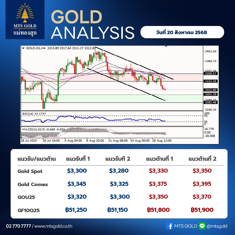 ในทางเทคนิคราคาทองคำเคลื่อนตัวในกรอบ Sideway down และใกล้ลงมาทดสอบแนวรับด้านล่างบริเวณ 3,300 เหรียญ ซึ่งเป็นแนวรับสำคัญในระยะสั้น สำหรับวันนี้คาดว่าราคาทองคำจะมีแนวรับที่ระดับ 3,300 เหรียญ และแนวต้านที่ระดับ 3,330 เหรียญ