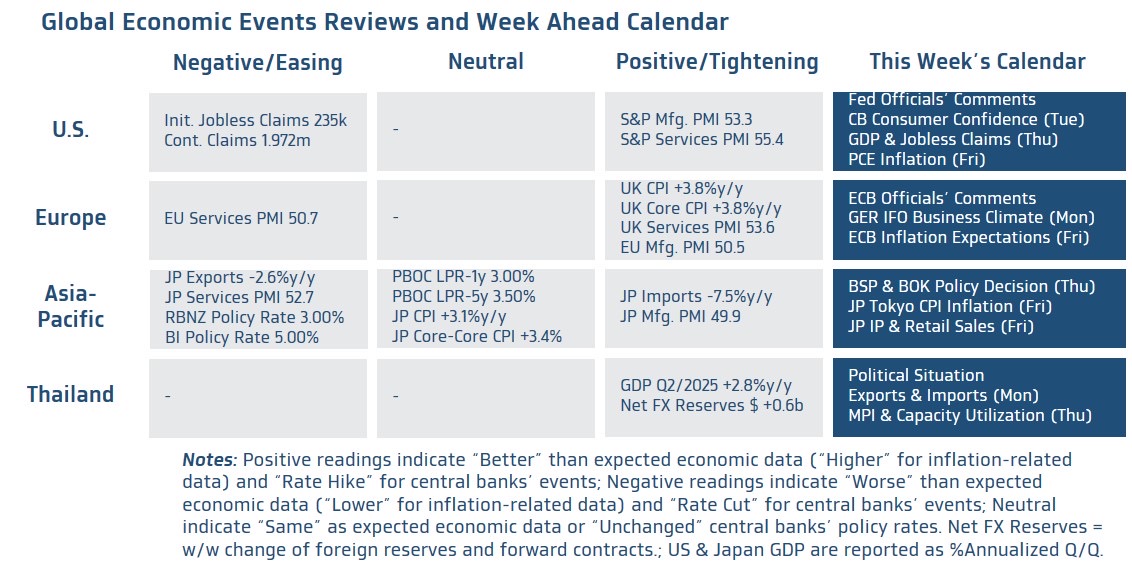 * ฝั่งไทย – ผู้เล่นในตลาดจะรอลุ้นผลการพิจารณาคดีนายกรัฐมนตรีแพทองธาร ชินวัตร โดยศาลรัฐธรรมนูญในวันที่ 29 สิงหาคม นี้ ซึ่งอาจสร้างนำไปสู่ความวุ่นวายของการเมืองไทยในระยะสั้น โดยเฉพาะในกรณีที่ศาลรัฐธรรมนูญวินิจฉัยความเป็นนายกฯ ของนายกฯ แพทองธาร สิ้นสุดลง เนื่องจากจะต้องมีการลงคะแนนเสียงเลือกนายกฯ คนใหม่ พร้อมกันนั้นก็มีความเสี่ยงที่อาจเกิดการยุบสภาและการเลือกตั้งใหม่ได้ โดยเรามองว่ามีโอกาสราว 60% ที่พรรคเพื่อไทยยังสามารถรวบรวมเสียงจากบรรดาพรรคร่วมรัฐบาล เพื่อสนับสนุนแคนดิเดตจากพรรคเพื่อไทย (คุณชัยเกษม นิติสิริ) เป็นนายกฯ คนถัดไป และมีโอกาสราว 25% ที่พลเอกประยุทธ์ จันทร์โอชา อาจกลับมาเป็นนายกฯ ส่วนอีก 15% นั้น เราประเมินเป็นโอกาสที่จะเกิดการยุบสภาและเลือกตั้งใหม่ ในส่วนของรายงานข้อมูลเศรษฐกิจ ผู้เล่นในตลาดจะรอลุ้น รายงานยอดการส่งออกและนำเข้า รวมถึงรายงานดัชนีผลผลิตอุตสาหกรรม (Manufacturing Production Index) ในเดือนกรกฎาคม