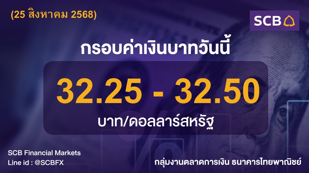 • กลุ่มงานตลาดการเงิน ธนาคารไทยพาณิชย์ ประเมินค่าเงินบาทวันนี้เคลื่อนไหวในกรอบ 32.25-32.50 บาท/ดอลลาร์