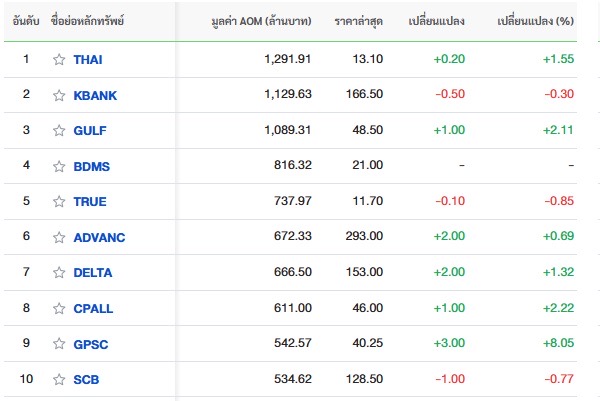 10 อันดับหลักทรัพย์ที่มีมูลค่าการซื้อขายสูงสุด