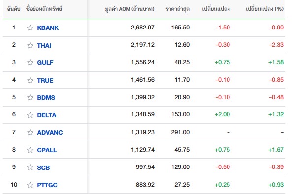 10 อันดับหลักทรัพย์ที่มีมูลค่าการซื้อขายสูงสุด