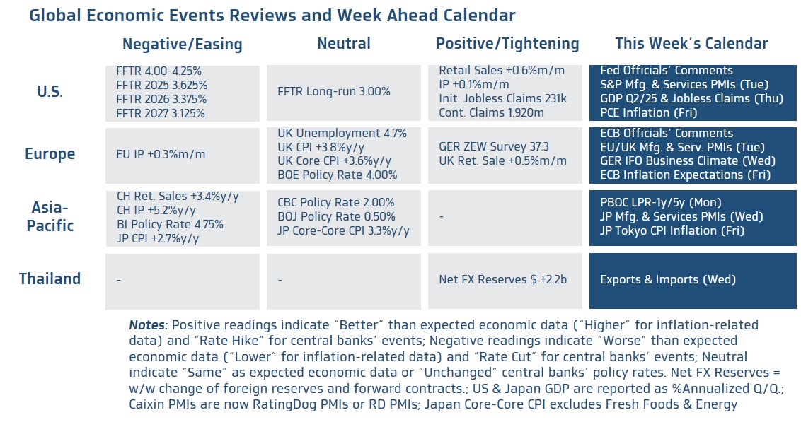 สำหรับในสัปดาห์นี้ เรามองว่า ควรรอลุ้นรายงานดัชนี PMI ภาคการผลิตและภาคการบริการของบรรดาประเทศเศรษฐกิจหลัก พร้อมรอติดตาม ถ้อยแถลงของบรรดาเจ้าหน้าที่เฟด