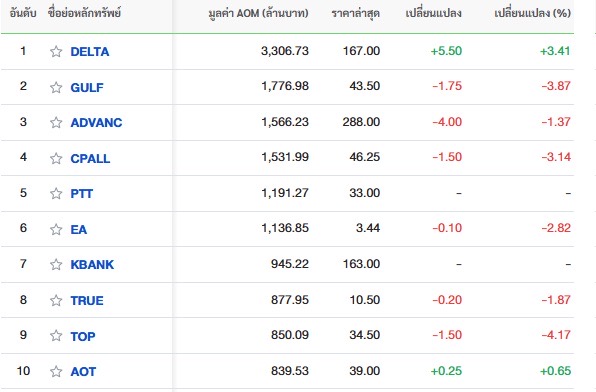 10 อันดับหลักทรัพย์ที่มีมูลค่าการซื้อขายสูงสุด