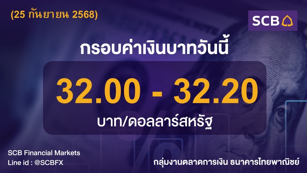 • กลุ่มงานตลาดการเงิน ธนาคารไทยพาณิชย์ ประเมินค่าเงินบาทวันนี้เคลื่อนไหวในกรอบ 32.00-32.20 บาท/ดอลลาร์