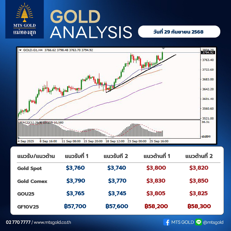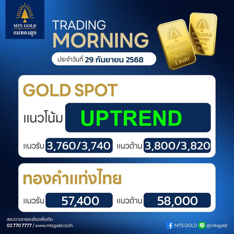 ราคาทองคำปรับตัวสูงขึ้นอย่างต่อเนื่องโดยขึ้นมาทดสอบจุดสูงสุดเดิมที่ระดับ 3,790 เหรียญ ในเช้านี้ โดยได้รับแรงสนับสนุนจากความมั่นใจว่าธนาคารกลางสหรัฐฯ (Fed) จะลดอัตราดอกเบี้ยอีก 0.25% ในการประชุมครั้งถัดไป เนื่องจากตัวเลขเศรษฐกิจของสหรัฐฯในคืนวันศุกร์ Core PCE Price Index m/m ออกมาทรงตัว ขณะที่ดัชนีดอลลาร์อ่อนค่าลงเล็กน้อยจากวันศุกร์เปิดที่ระดับ 98.49 จุด และเคลื่อนตัวระหว่าง 98.13-98.53 จุด ขณะที่เช้านี้อยู่ที่ระดับ 97.95 จุด ขณะที่ค่าเงินบาทอยู่ที่ระดับ 32.23 บาทต่อดอลลาร์ในเช้านี้ ส่งผลกระทบให้ราคาทองไทยขยับเข้าใกล้ 58,000 บาทต่อบาททองคำ โดยเช้านี้อยู่ที่ระดับ 57,850 บาทต่อบาททองคำขณะที่สงครามรัสเซีย-ยูเครน ยังคงตึงเครียด โดยล่าสุดรัสเซียระดมโจมตีทางอากาศครั้งใหญ่ในยูเครนเมื่อวันอาทิตย์ ทำให้มีผู้เสียชีวิตและบาดเจ็บหลายสิบ อย่างไรก็ดี ในสภาวะที่ความผันผวนสูง MTS Gold ยังคงแนะนำให้ซื้อทองคำเพื่อการออมผ่านแอปพลิเคชัน เนื่องจากมีความสะดวก รวดเร็ว และประหยัดเวลาเดินทางมาที่หน้าร้าน โดย MTS Gold ได้พัฒนาแอปพลิเคชันใหม่ชื่อ MTSGoldx ซึ่งมีความสะดวกสูงมากสำหรับลูกค้ารายย่อย ด้วยจุดเด่นดังนี้: 1.การสมัครใช้งาน โหลดง่ายผ่าน Google Play และ App Store และสมัครใช้งานได้ทันทีภายในเวลาไม่ถึงครึ่งชั่วโมง 2. ซื้อขายได้ไม่จำกัดธนาคาร แม้จะมีบัญชีธนาคารใดก็ตาม 3. ใช้เงินลงทุนเริ่มต้นเพียง 3,000 บาท 4. หน่วยการซื้อขายเป็น สกุลเงินบาท ทำให้ซื้อง่ายขายคล่อง และสามารถขายทำกำไรได้ตลอดเวลาทำการ (จันทร์-ศุกร์ 07:00-03:00 น.) 5. ลูกค้าสามารถ ตั้งราคาซื้อและราคาขายล่วงหน้า ได้ตามราคาที่ต้องการ โดยไม่ต้องเฝ้าหน้าจอหรือเดินทางมาที่ร้าน 6. สามารถแลกรับทองคำได้ที่ร้านแม่ทองสุกทุกสาขาในเร็วๆ นี้