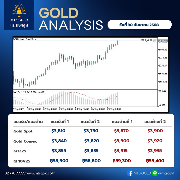 สำหรับ Gold Online Futures คาดจะมีกรอบแนวรับ 3,855 เหรียญ และแนวต้าน 3,915 เหรียญ และ Gold Comex คาดจะมีกรอบแนวรับ 3,840 เหรียญ และแนวต้าน 3,900 เหรียญ ในส่วนของราคาทองไทยจะมีแนวรับระยะสั้นที่ 58,400 บาท/บาททองคำ และมีแนวต้านระยะสั้นที่ 59,000 บาท/บาททองคำ