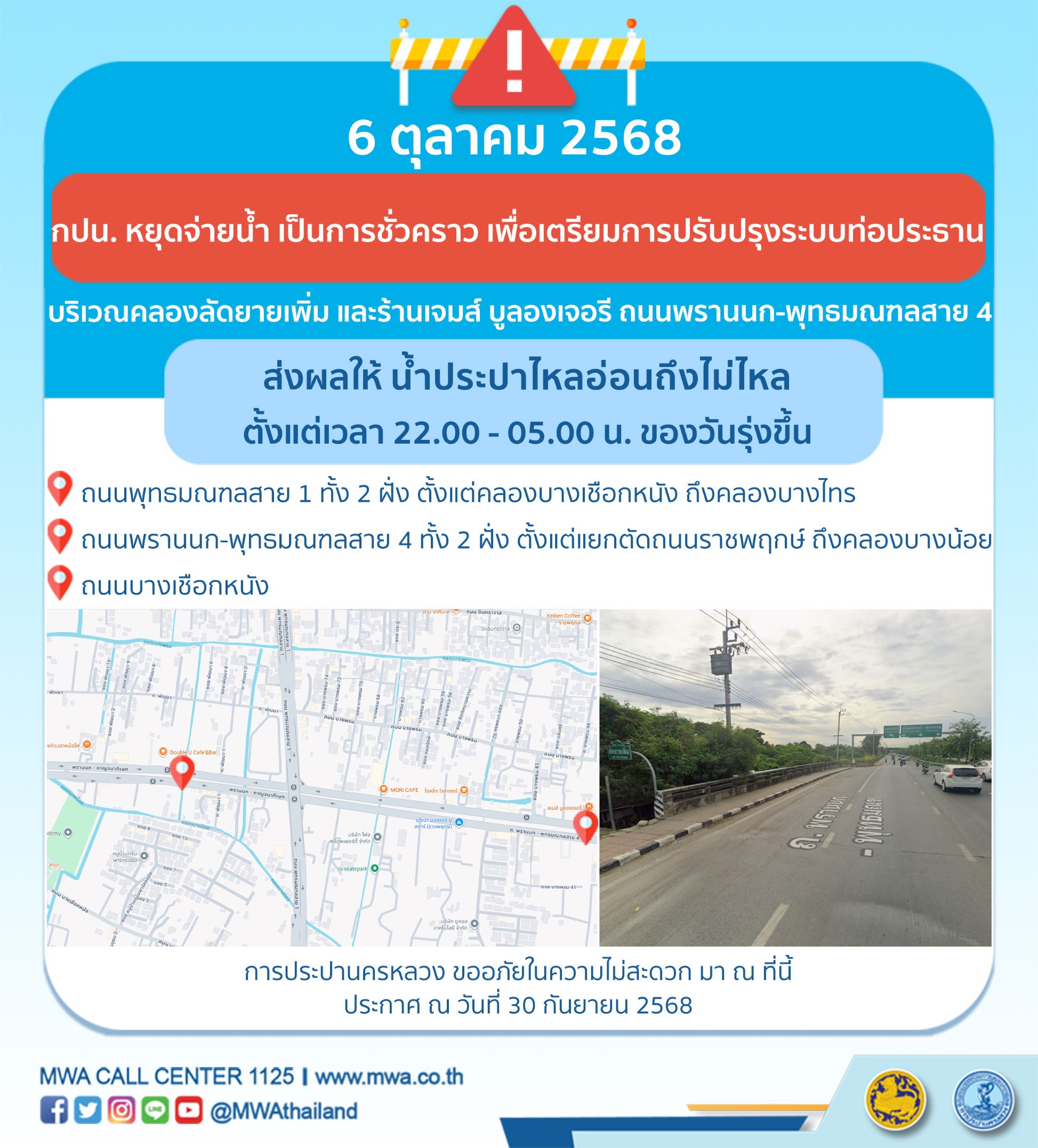 การประปานครหลวง (กปน.) ขอแจ้งให้ทราบว่า จะเตรียมการปรับปรุงระบบท่อประธาน ในพื้นที่บริเวณคลองลัดยายเพิ่ม และร้านเจมส์ บูลองเจอรี ถนนพรานนก-พุทธมณฑลสาย 4 เพื่อให้ประชาชนได้รับบริการน้ำประปาอย่างเพียงพอและทั่วถึง จึงมีความจำเป็นต้องหยุดจ่ายน้ำ เป็นการชั่วคราว ในคืนวันจันทร์ที่ 6 ตุลาคม 2568 ตั้งแต่เวลา 22.00 - 05.00 น. ของวันรุ่งขึ้น โดยระหว่างดำเนินการ ส่งผลให้ น้ำประปาไหลอ่อนถึงไม่ไหล ในพื้นที่ดังต่อไปนี้