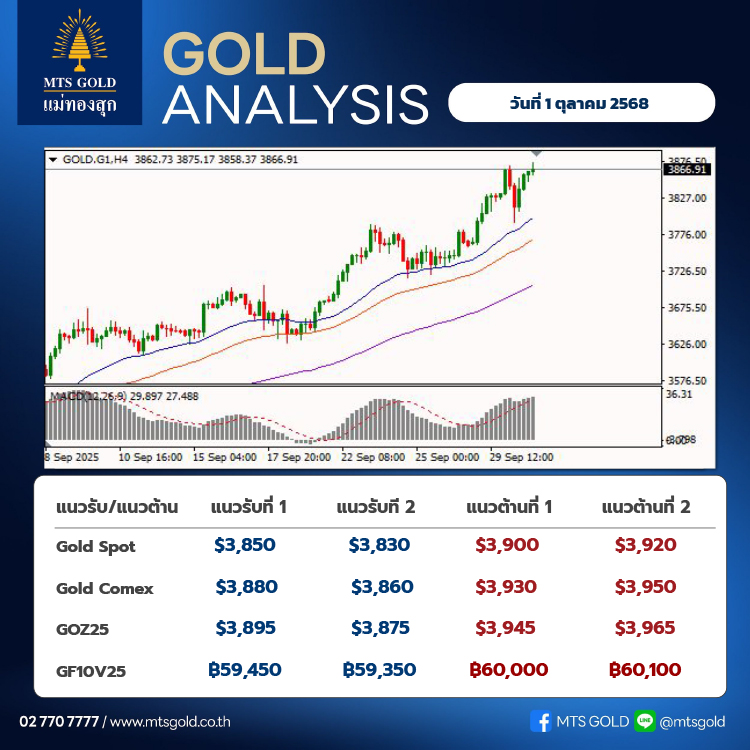 ราคาทองคำปรับตัวสูงขึ้นอย่างต่อเนื่องในเช้านี้ และได้ทดสอบจุดสูงสุดเดิมที่ระดับ 3,870 เหรียญ โดยเมื่อวานนี้มีบางช่วงที่ราคาร่วงลงอย่างรุนแรงถึง 80 เหรียญ จากบริเวณ 3,871 เหรียญ ลงมาที่ 3,793 เหรียญอย่างรวดเร็ว ก่อนจะสามารถดีดกลับขึ้นมาได้ที่ระดับ 3,866 เหรียญในเช้านี้ ภาพรวมตลาดยังคงให้ความสำคัญกับการประชุมสภาของสหรัฐฯ ซึ่งล่าสุดถ้อยแถลงที่ออกมายังไม่สามารถตกลงกันได้ โดยตลาดคาดการณ์ว่าอาจจะยังไม่สามารถบรรลุข้อตกลงได้ เนื่องจากทั้งสองฝ่ายยังมีจุดยืนที่ไม่ตรงกัน และคาดว่าจะเกิด Government Shutdown หลังเที่ยงวันนี้ตามเวลาประเทศไทย แม้ภาวะ Government Shutdown จะเป็นเพียงชั่วคราว แต่คาดว่าผลกระทบหลักจะเกิดขึ้นใน 2 ส่วน ได้แก่ ทางกระทรวงจะไม่สามารถเปิดเผยข้อมูลเศรษฐกิจที่สำคัญหากรัฐบาลเผชิญภาวะชัตดาวน์ โดยข้อมูลเศรษฐกิจที่จะได้รับผลกระทบได้แก่ตัวเลขผู้ขอรับสวัสดิการว่างงานซึ่งมีกำหนดเผยแพร่ในวันที่ 2 ต.ค., ตัวเลขการจ้างงานนอกภาคเกษตรที่มีกำหนดเผยแพร่ในวันที่ 3 ต.ค. และดัชนีราคาผู้บริโภค (CPI) ที่มีกำหนดเผยแพร่ในวันที่ 15 ต.ค. นอกจากนี้จะส่งผลกระทบต่อความเชื่อมั่น ทำให้ค่าเงินดอลลาร์สหรัฐอ่อนค่าลง