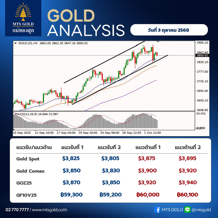 ในช่วงต้นตลาด COMEX ราคาทองคำมีการปรับฐานทำกำไร ส่งผลให้ราคาปรับตัวลดลงมาทดสอบแนวรับระยะสั้นแถวบริเวณ 3,825 เหรียญ ก่อนจะสามารถดีดกลับมาปิดที่ระดับ 3,856 เหรียญได้ อย่างไรก็ตาม โดยรวมถือเป็นแรงเทขายทำกำไรตามปกติ ซึ่งยังไม่มีข่าวสำคัญหรือปัจจัยพิเศษเข้ามากระทบอย่างชัดเจน ขณะที่ภาวะ Government Shutdown ของรัฐบาลสหรัฐฯ ยังไม่มีข้อยุติที่ชัดเจน ซึ่งตลาดกำลังเฝ้าดูว่าสถานการณ์ Government Shutdown นี้จะดำเนินไปนานแค่ไหน ส่งผลให้วันนี้อาจจะไม่มีการเผยแพร่ตัวเลขเศรษฐกิจที่สำคัญของสหรัฐฯ ขณะที่เมื่อวานนี้ดัชนีดอลลาร์สหรัฐฯ เปิดที่ระดับ 97.70 จุด และเคลื่อนตัวระหว่าง 97.52-98.13 จุด ขณะที่เช้านี้อยู่ที่ระดับ 97.88 จุด ขณะที่ค่าเงินบาทอ่อนค่าลงมาอยู่ที่ 32.45 บาทต่อดอลลาร์ในเช้านี้ ส่งผลให้ราคาทองไทยสามารถทรงตัวเหนือระดับ 59,000 บาทต่อบาททองคำได้ โดยเมื่อวานนี้มีบางช่วงที่ราคาทองไทยร่วงลงต่ำสุดที่ระดับ 58,300 บาทต่อบาททองคำ โดยเช้านี้กลับมาเปิดที่ 59,200 บาทต่อบาททองคำ