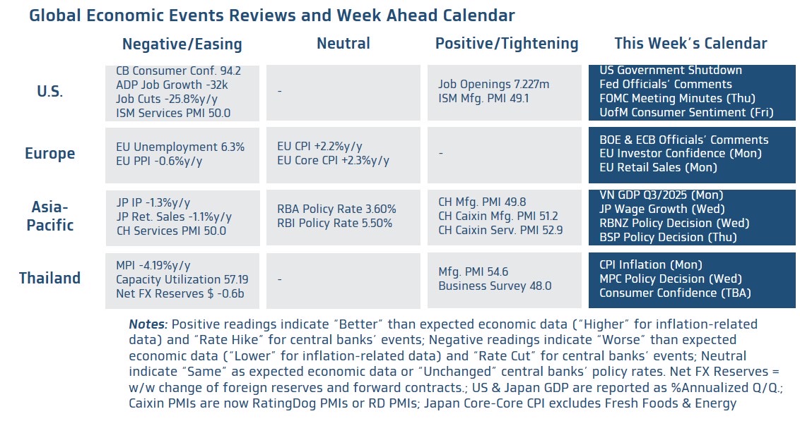 สำหรับในสัปดาห์นี้ เรามองว่า ถ้อยแถลงของบรรดาเจ้าหน้าที่เฟด และภาวะ US Government Shutdown พร้อมรอลุ้นผลการประชุมคณะกรรมการนโยบายการเงิน (กนง.)
