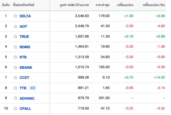 10 อันดับหลักทรัพย์ที่มีมูลค่าการซื้อขายสูงสุด