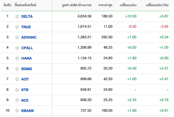10 อันดับหลักทรัพย์ที่มีมูลค่าการซื้อขายสูงสุด