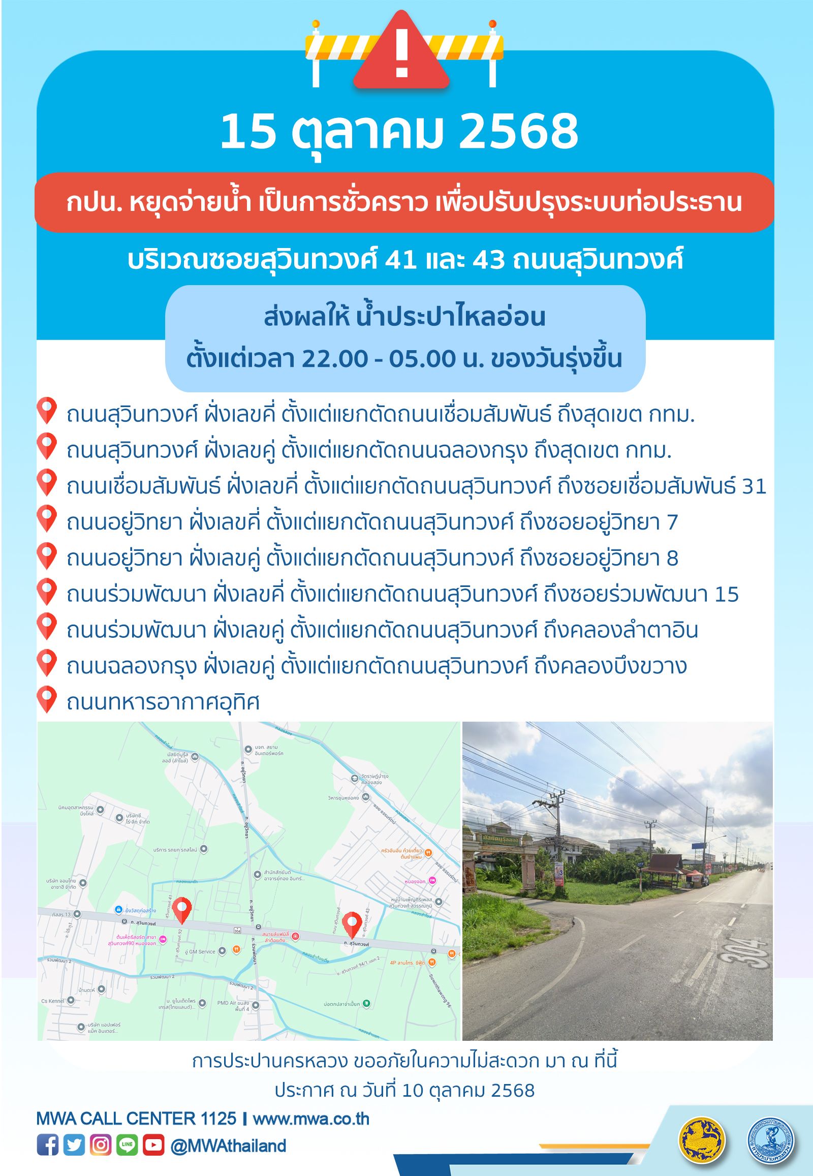 การประปานครหลวง (กปน.) ขอแจ้งให้ทราบว่า จะดำเนินการปรับปรุงระบบท่อประธาน ในพื้นที่บริเวณซอยสุวินทวงศ์ 41 และ 43 ถนนสุวินทวงศ์ เพื่อให้ประชาชนได้รับบริการน้ำประปาอย่างเพียงพอและทั่วถึง จึงมีความจำเป็นต้องหยุดจ่ายน้ำ เป็นการชั่วคราว ในคืนวันพุธที่ 15 ตุลาคม 2568 ตั้งแต่เวลา 22.00 - 05.00 น. ของวันรุ่งขึ้น โดยระหว่างดำเนินการ ส่งผลให้ น้ำประปาไหลอ่อน ในพื้นที่ดังต่อไปนี้