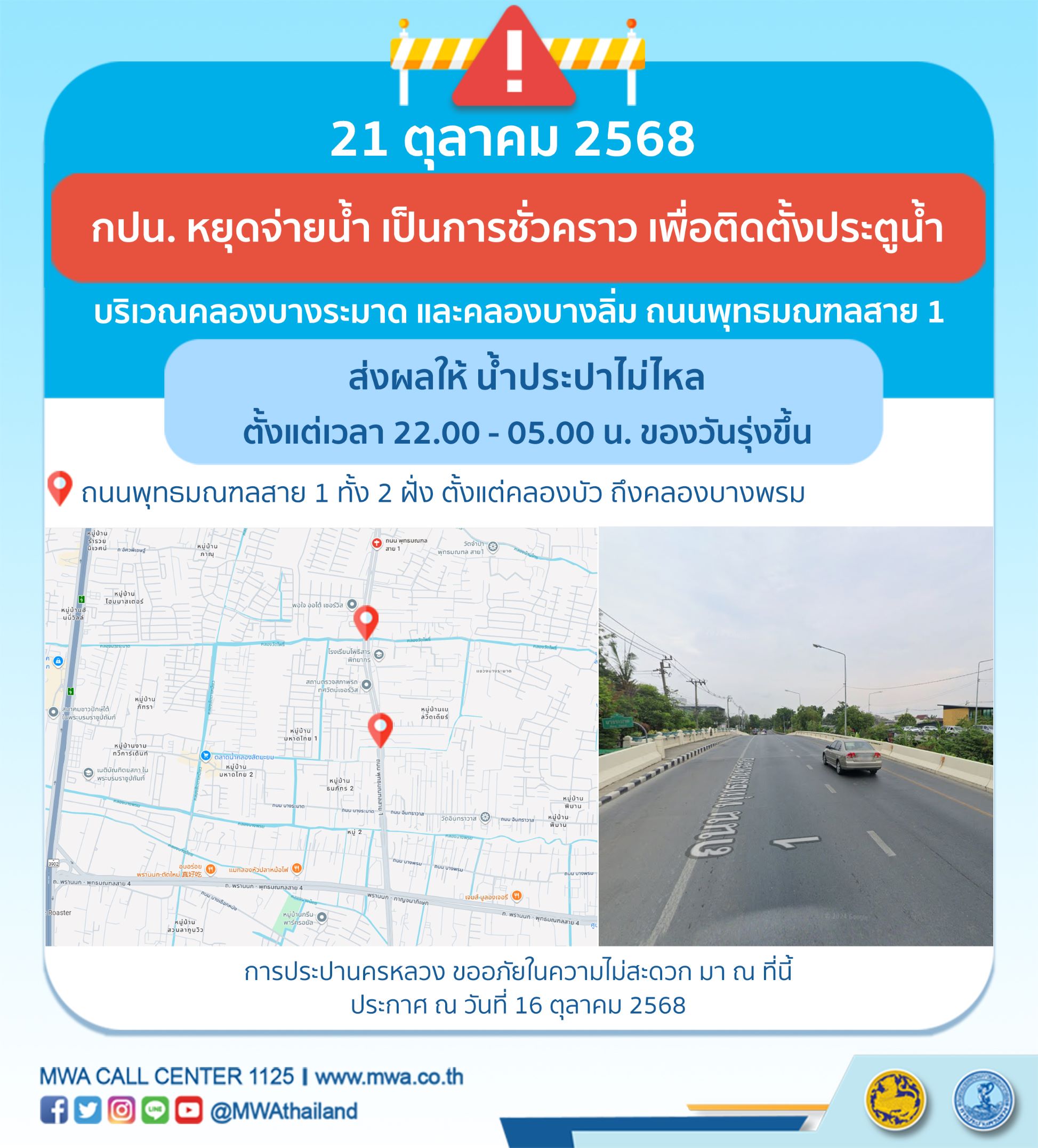 การประปานครหลวง (กปน.) ขอแจ้งให้ทราบว่า จะดำเนินการติดตั้งประตูน้ำ ในพื้นที่บริเวณคลองบางระมาด และคลองบางลิ่ม ถนนพุทธมณฑลสาย 1 เพื่อให้ประชาชนได้รับบริการน้ำประปาอย่างเพียงพอและทั่วถึง จึงมีความจำเป็นต้องหยุดจ่ายน้ำ เป็นการชั่วคราว ในคืนวันอังคารที่ 21 ตุลาคม 2568 ตั้งแต่เวลา 22.00 - 05.00 น. ของวันรุ่งขึ้น โดยระหว่างดำเนินการ ส่งผลให้ น้ำประปาไม่ไหล ในพื้นที่ดังต่อไปนี้