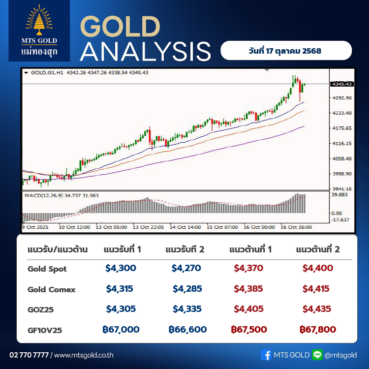 สำหรับ Gold Online Futures คาดจะมีกรอบแนวรับ 4,240 เหรียญ และแนวต้าน 4,300 เหรียญ และ Gold Comex คาดจะมีกรอบแนวรับ 4,215 เหรียญ และแนวต้าน 4,275 เหรียญ ในส่วนของราคาทองไทยจะมีแนวรับระยะสั้นที่ 64,500 บาท/บาททองคำ และมีแนวต้านระยะสั้นที่ 65,300 บาท/บาททองคำ