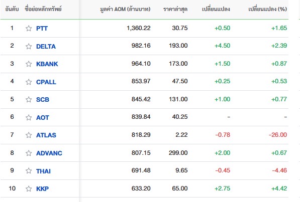 10 อันดับหลักทรัพย์ที่มีมูลค่าการซื้อขายสูงสุด
