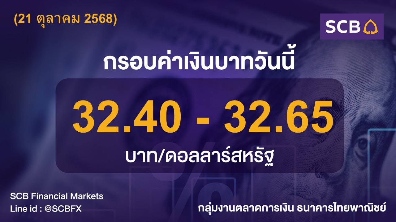 • กลุ่มงานตลาดการเงิน ธนาคารไทยพาณิชย์ ประเมินค่าเงินบาทวันนี้เคลื่อนไหวในกรอบ 32.40-32.65 บาท/ดอลลาร์