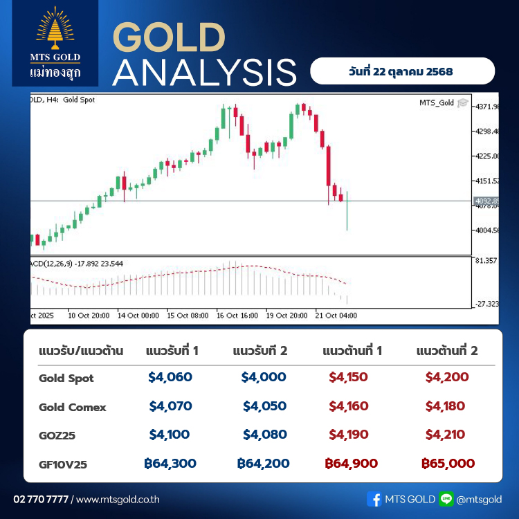 ราคาทองคำกลับร่วงลงรุนแรง โดยในเชิงเทคนิคถือเป็นการปรับฐานครั้งใหญ่ หลังจากที่ทองคำเข้าสู่ภาวะ Overbought ค่อนข้างมาก ซึ่งหากดูตาม Fibonacci Retracement จะพบว่าราคาร่วงลงมาในระยะปานกลางลงมาทดสอบบริเวณ 61.8% ที่ระดับ 4,113 เหรียญ ซี่งในทางเทคนิคระยะสั้น เริ่มกลับเข้าสู่ภาวะสมดุล เริ่มเป็น Overbought เล็กน้อย และเริ่มมีสัญญาณการกลับตัวในระยะสั้นมาก จึงคาดว่าราคาน่าจะสามารถทรงตัวได้แถวบริเวณ 4,100 เหรียญ สำหรับวันนี้คาดว่าราคาทองคำจะมีกรอบแนวรับอยู่ที่ระดับ 4,060 เหรียญ และแนวต้านอยู่ที่ระดับ 4,150 เหรียญ แนะนำควรบริหารความเสี่ยงให้ดีในการลงทุน และอาจจะต้องมีคำสั่ง Stop Loss สำหรับพอร์ตโฟลิโอต่างๆ เพื่อบริหารความเสี่ยง