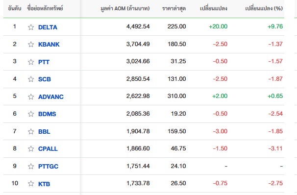 10 อันดับหลักทรัพย์ที่มีมูลค่าการซื้อขายสูงสุด