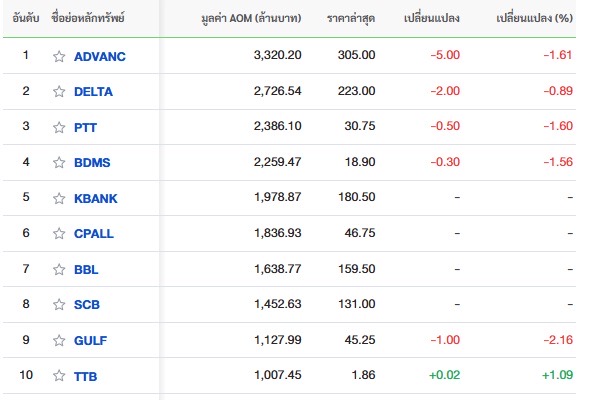 10 อันดับหลักทรัพย์ที่มีมูลค่าการซื้อขายสูงสุด