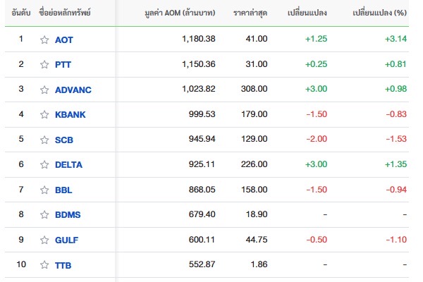 10 อันดับหลักทรัพย์ที่มีมูลค่าการซื้อขายสูงสุด