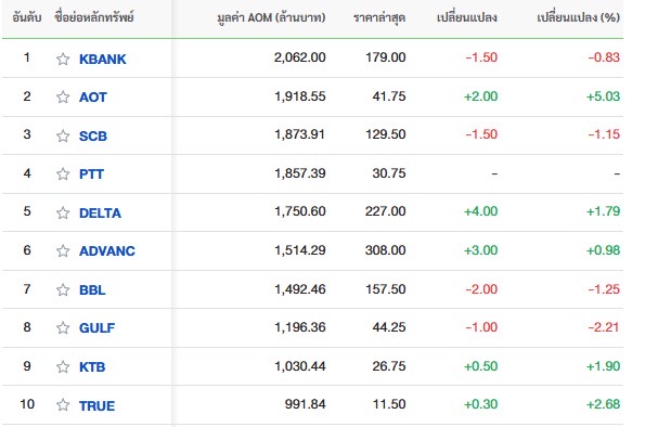 10 อันดับหลักทรัพย์ที่มีมูลค่าการซื้อขายสูงสุด