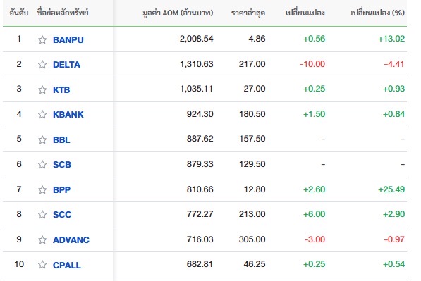 10 อันดับหลักทรัพย์ที่มีมูลค่าการซื้อขายสูงสุด