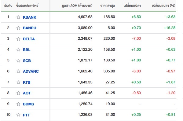 10 อันดับหลักทรัพย์ที่มีมูลค่าการซื้อขายสูงสุด