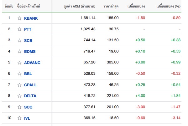 10 อันดับหลักทรัพย์ที่มีมูลค่าการซื้อขายสูงสุด
