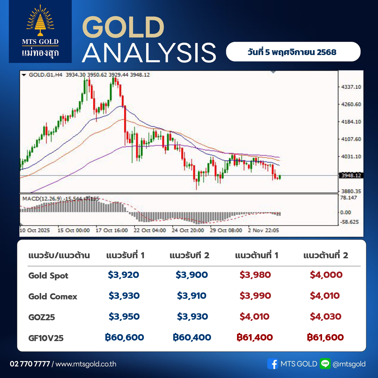 ในเชิงเทคนิค ราคาทองคำยังคงอยู่ในช่วงของการปรับฐานต่อเนื่อง (Correction) และมีทิศทางการเคลื่อนไหวแบบ Sideway Down หลังจากที่ราคาหลุดต่ำกว่า เส้นค่าเฉลี่ย 30 วัน ลงมา ส่งผลให้แนวโน้มระยะกลางได้เปลี่ยนเข้าสู่ทิศทางขาลง การพักฐานครั้งนี้คาดว่าจะกินเวลาต่อเนื่องไปอีกระยะหนึ่ง โดยประเมินว่า ราคาทองคำจะยังคงอยู่ในช่วงของการสร้างฐานไปจนถึงช่วงกลางเดือนธันวาคม และคาดว่าการปรับฐานจะเริ่มจบลงในช่วงปลายปี การพักฐานในครั้งนี้ถือเป็นช่วงเวลาสำคัญให้นักลงทุนได้ ปรับมุมมองและปรับพอร์ต เพื่อเตรียมพร้อมสำหรับการกลับตัว โดยคาดการณ์ว่าราคาทองคำจะสามารถ กลับขึ้นเป็นทิศทางขาขึ้นได้อีกครั้งในช่วงต้นปีหน้า แนะนำนักลงทุนระยะสั้น ยังคงต้องใช้ความระมัดระวัง และ คุมความเสี่ยงของพอร์ต ขณะที่นักลงทุนระยะยาว ควรใช้จังหวะที่ราคาอ่อนตัวนี้เป็นโอกาสในการ ทยอยเข้าซื้อสะสมทองคำ เพื่อรอรับการกลับตัวเป็นขาขึ้นในระยะยาว ประเมินกรอบระยะสั้น แนวรับที่ 3,920-3,900 เหรียญ และแนวต้านที่ 3,980-4,000 เหรียญ ขณะที่ทองไทยจะมีแนวรับที่ 60,200 บาท และแนวต้านที่ 61,000 บาท