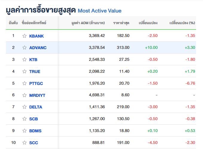 10 อันดับหลักทรัพย์ที่มีมูลค่าการซื้อขายสูงสุด