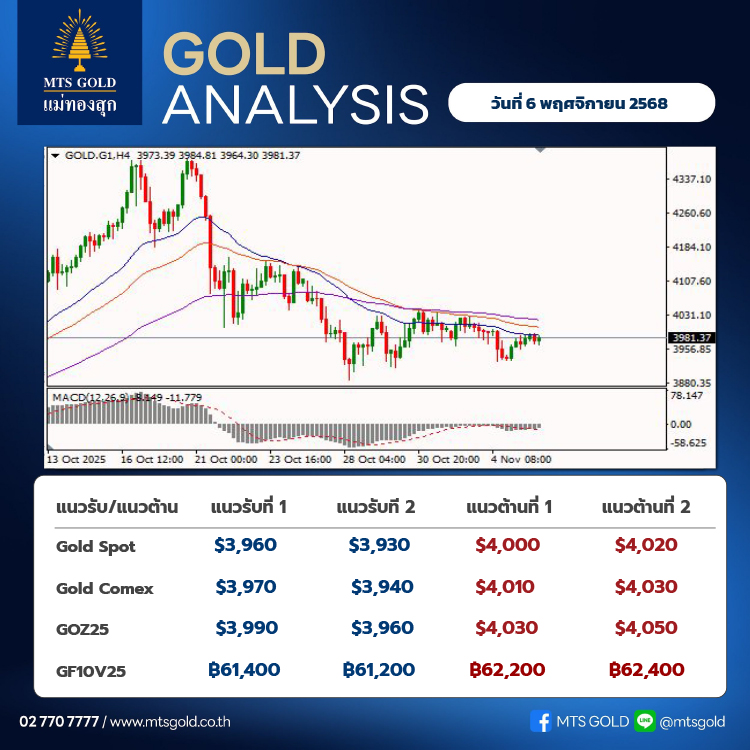 ในเชิงเทคนิค ราคาทองคำยังคงอยู่ในช่วงการปรับฐาน โดยภาพรวมเคลื่อนไหวในลักษณะ Sideway Down หลังจากราคาหลุดต่ำกว่าเส้นค่าเฉลี่ย 30 วัน และราคายังคงเคลื่อนไหวต่ำกว่าระดับสำคัญที่ 4,000 เหรียญ ทำให้แนวโน้มระยะสั้นยังรอปัจจัยใหม่เข้ามาหนุนเพื่อรอการเลือกทางประเมินกรอบระยะสั้น แนวรับที่ 3,960-3,930 เหรียญ และแนวต้านที่ 4,000-4,020 เหรียญ ขณะที่ทองไทยจะมีแนวรับที่ 60,600 บาท และแนวต้านที่ 61,600 บาท