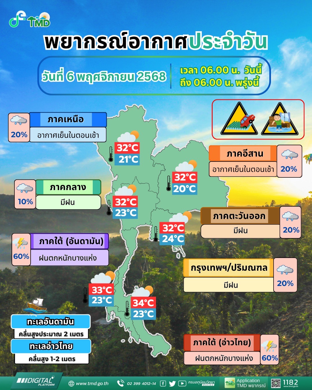 กรมอุตุนิยมวิทยา พยากรณ์อากาศ 24 ชั่วโมงข้างหน้า วันที่ 6 พฤศจิกายน 2568 บริเวณภาคใต้มีฝนตกหนักเกิดขึ้นได้บางพื้นที่ โดยเฉพาะจังหวัดเพชรบุรี ประจวบคีรีขันธ์ ชุมพร ระนอง และพังงา ส่วนประเทศไทยตอนบนมีฝนน้อย เนื่องจากร่องมรสุมพาดผ่านภาคใต้ตอนบน อ่าวไทยตอนบน และภาคตะวันออก ในขณะที่บริเวณความกดอากาศสูงหรือมวลอากาศเย็นกำลังปานกลางจากประเทศจีนที่ปกคลุมภาคตะวันออกเฉียงเหนือมีกำลังอ่อน แต่ยังคงทำให้บริเวณภาคเหนือตอนบนและภาคตะวันออกเฉียงเหนือมีอากาศเย็นในตอนเช้า ขอให้เกษตรกรเตรียมการป้องกันและระวังความเสียหายที่จะเกิดต่อผลผลิตทางการเกษตร รวมทั้งดูแลรักษาสุขภาพเนื่องจากสภาพอากาศที่เปลี่ยนแปลง และเพิ่มความระมัดระวังในการสัญจรผ่านบริเวณที่มีฝนตก รวมถึงระวังอันตรายจากฝนตกหนักซึ่งอาจทำให้เกิดน้ำท่วมได้ในบางพื้นที่