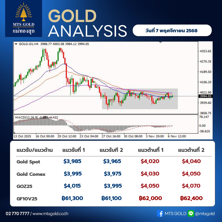 ในเชิงเทคนิคราคาทองคำยังคงแสดงสัญญาณของการฟื้นตัวเกิด Technical Rebound สามารถทรงตัวได้บริเวณ 3,990 -4,000 เหรียญ และราคาทองคำไม่ทำจุดต่ำสุดใหม่ ซึ่งเป็นการส่งสัญญาณเชิงบวก ภาพรวมในวันนี้จึงบ่งชี้ว่าราคาทองคำยังคงอยู่ในช่วงของการ สะสมพลัง โดยเคลื่อนไหวในกรอบ Sideways เพื่อรอปัจจัยใหม่เข้ามากำหนดทิศทางที่ชัดเจน ประเมินกรอบระยะสั้น แนวรับที่ 3,985-3,965 เหรียญ และแนวต้านที่ 4,020-4,040 เหรียญ ขณะที่ทองไทยจะมีแนวรับที่ 60,600 บาท และแนวต้านที่ 61,600 บาท