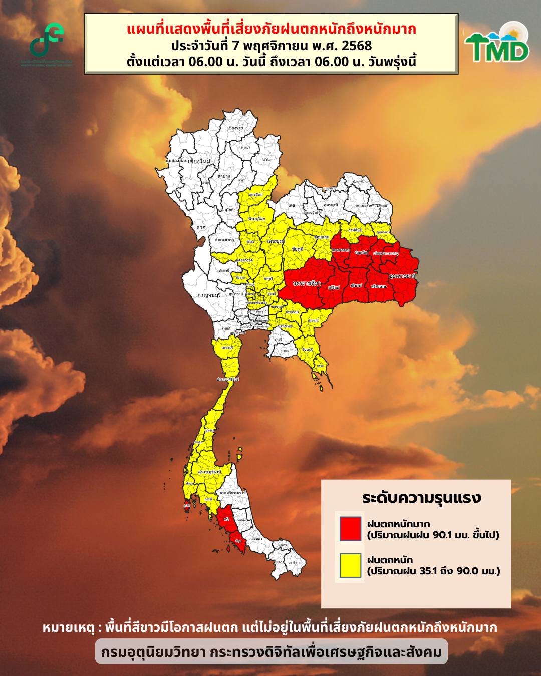 กรมอุตุนิยมวิทยา พยากรณ์อากาศประจำวันนี้ (7 พ.ย. 68) โดยเน้นย้ำถึงอิทธิพลของพายุและลมมรสุม ซึ่งทำให้หลายพื้นที่ของประเทศไทยมีฝนตกหนักถึงหนักมาก และมีลมแรง