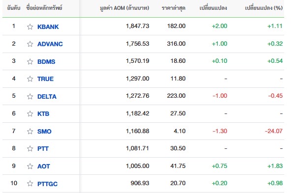 10 อันดับหลักทรัพย์ที่มีมูลค่าการซื้อขายสูงสุด