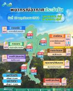 กรมอุตุนิยมวิทยา พยากรณ์อากาศ 24 ชั่วโมงข้างหน้า วันที่ 13 พฤศจิกายน 2568 ประเทศไทยยังคงมีฝนฟ้าคะนอง และมีฝนตกหนักบางแห่งในภาคกลางตอนล่าง รวมทั้งกรุงเทพมหานครและปริมณฑล ภาคตะวันออก และภาคใต้ตอนบน ในขณะที่ภาคตะวันออกเฉียงเหนือจะมีอุณหภูมิลดลง 1-3 องศาเซลเซียส กับมีลมแรง เนื่องจากบริเวณความกดอากาศสูงหรือมวลอากาศเย็นกำลังค่อนข้างแรงจากประเทศจีนได้แผ่ลงมาปกคลุมภาคตะวันออกเฉียงเหนือตอนบนแล้ว คาดว่าจะแผ่ลงมาปกคลุมภาคตะวันออกเฉียงเหนือตอนล่าง และทะเลจีนใต้ในวันนี้ (13 พ.ย. 68) ส่งผลให้มีลมตะวันออกและลมตะวันออกเฉียงใต้พัดนำความชื้นเข้ามาปกคลุมภาคตะวันออก ภาคกลาง รวมทั้งกรุงเทพมหานครและปริมณฑล ภาคใต้ตอนบน และภาคเหนือตอนล่าง ขอให้ประชาชนในบริเวณดังกล่าวดูแลรักษาสุขภาพเนื่องจากสภาพอากาศที่เปลี่ยนแปลงไว้ด้วย