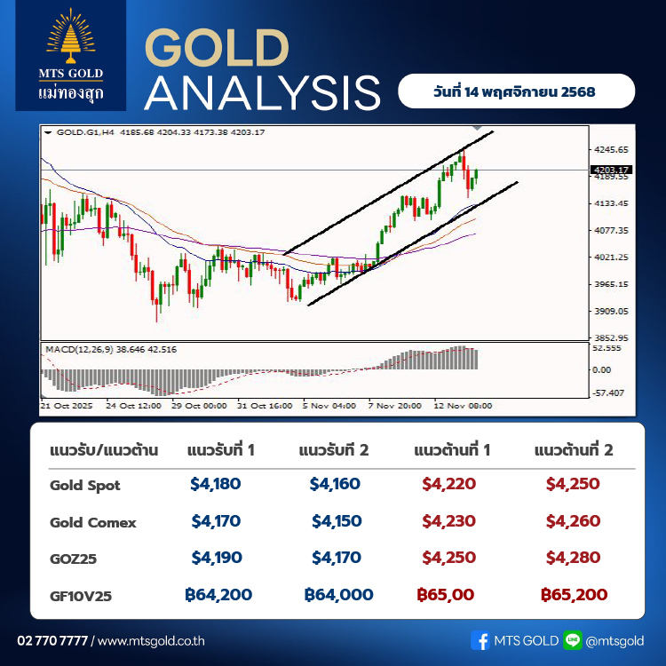 สำหรับ Gold Online Futures คาดจะมีกรอบแนวรับ 4,190 เหรียญ และแนวต้าน 4,250 เหรียญ และ Gold Comex คาดจะมีกรอบแนวรับ 4,170 เหรียญ และแนวต้าน 4,230 เหรียญ Gold Futures Series V25 จะมีแนวรับที่ระดับ 64,200 บาท และแนวต้านที่ระดับ 65,000 บาท