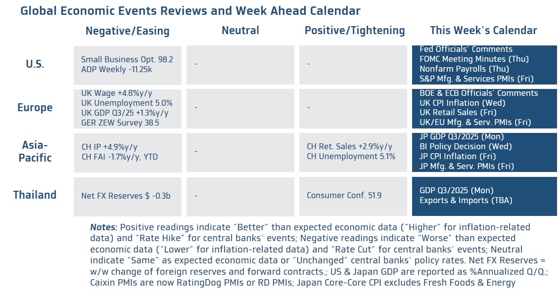 สำหรับในสัปดาห์นี้ เรามองว่า ควรรอลุ้น ข้อมูลตลาดแรงงานสหรัฐฯ ดัชนี PMI ภาคการผลิตและภาคการบริการของประเทศเศรษฐกิจหลัก และอัตราการเติบโตเศรษฐกิจไทย ไตรมาส 3 พร้อมรอติดตาม ถ้อยแถลงของบรรดาเจ้าหน้าที่เฟด