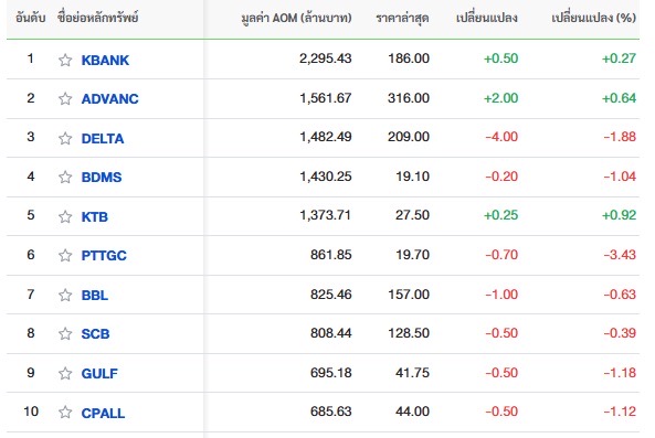 10 อันดับหลักทรัพย์ที่มีมูลค่าการซื้อขายสูงสุด