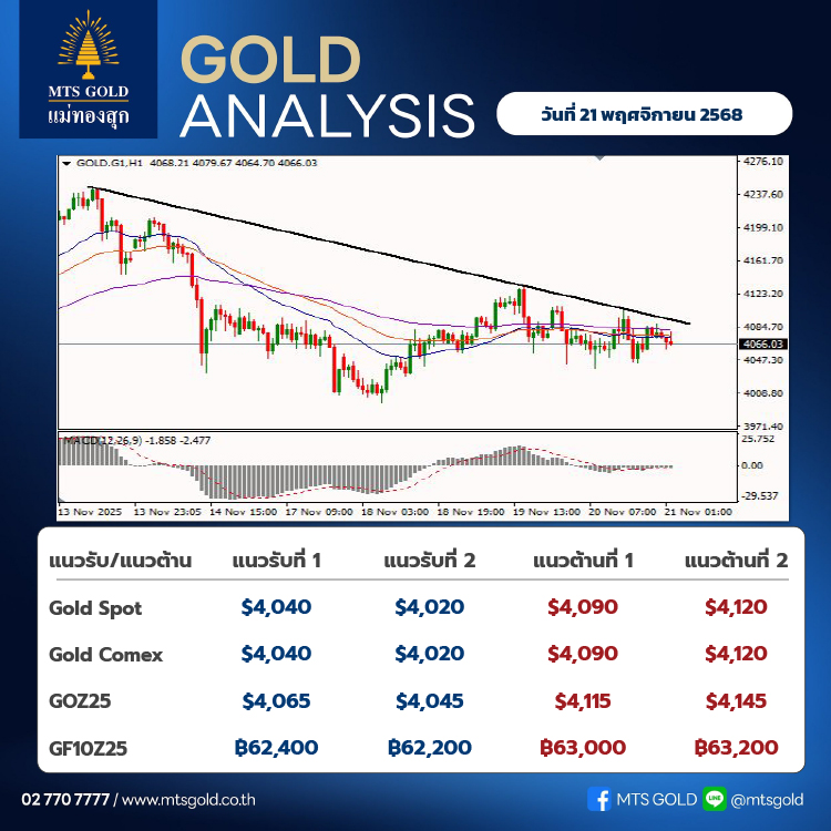 ในเชิงเทคนิค ราคาทองคำยังอยู่ในช่วงขาลงระยะสั้น และกลาง ภาพรวมยังเคลื่อนไหวในกรอบ “Sideway down” ยังคงแนะนำนักลงทุน ให้ระมัดระวังแรงขายในระยะสั้น ประเมินกรอบระยะสั้น แนวรับที่ 4,040-4,025 เหรียญ และแนวต้านที่ 4,090-4,120 เหรียญ ขณะที่ทองไทยจะมีแนวรับที่ 62,000 บาท และแนวต้านที่ 62,800 บาท