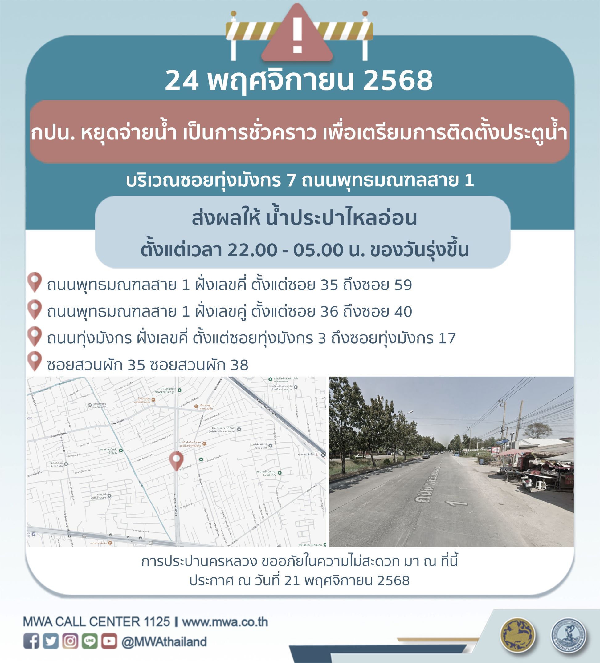 การประปานครหลวง (กปน.) ขอแจ้งให้ทราบว่า จะเตรียมการติดตั้งประตูน้ำ ในพื้นที่บริเวณซอยทุ่งมังกร 7 ถนนพุทธมณฑลสาย 1 เพื่อให้ประชาชนได้รับบริการน้ำประปาอย่างเพียงพอและทั่วถึง จึงมีความจำเป็นต้องหยุดจ่ายน้ำ เป็นการชั่วคราว ในคืนวันจันทร์ที่ 24 พฤศจิกายน 2568 ตั้งแต่เวลา 22.00 - 05.00 น. ของวันรุ่งขึ้น โดยระหว่างดำเนินการ ส่งผลให้ น้ำประปาไหลอ่อน ในพื้นที่ดังต่อไปนี้