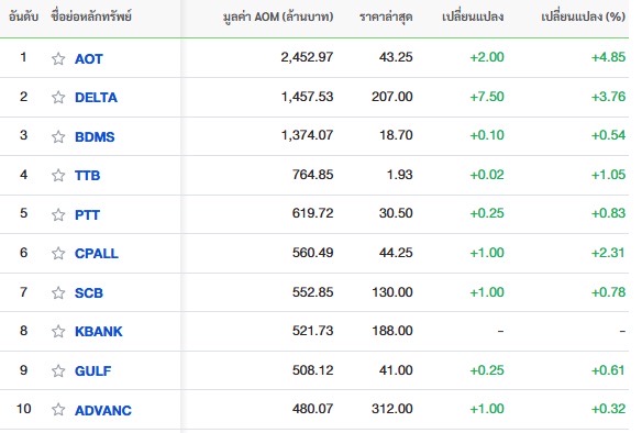 10 อันดับหลักทรัพย์ที่มีมูลค่าการซื้อขายสูงสุด