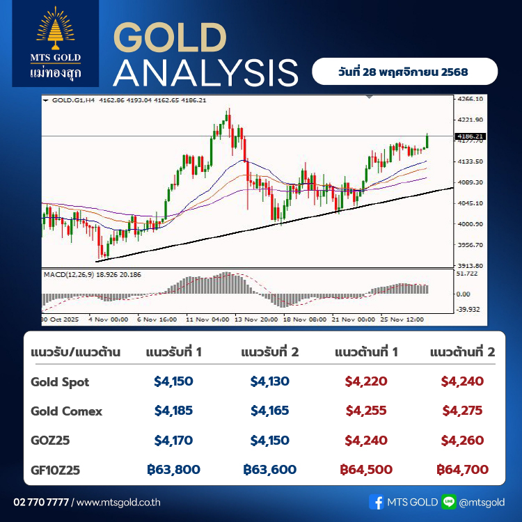 ในเชิงเทคนิค ราคาทองคำมีสัญญาณว่าแรงซื้อเริ่มกลับเข้าสู่ตลาดอย่างต่อเนื่อง ซึ่งช่วยเพิ่มความเชื่อมั่นให้นักลงทุนในการเข้าซื้อ หากราคาสามารถกลับขึ้นไปยืนเหนือระดับ 4,200 เหรียญได้อีกครั้ง จะมีแนวต้านถัดไปจะอยู่ที่บริเวณจุดสูงสุดเดิม คือ 4,240 เหรียญ โดยประเมินทิศทางโดยรวมเป็นการเคลื่อนไหวในรูปแบบ "Sideway Up" ประเมินกรอบระยะสั้น แนวรับที่ 4,150-4,130 เหรียญ และแนวต้านที่ 4,220-4,240 เหรียญ ขณะที่ทองไทยจะมีแนวรับที่ 63,400 บาท และแนวต้านที่ 64,100 บาท
