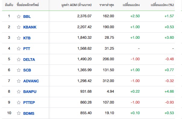 10 อันดับหลักทรัพย์ที่มีมูลค่าการซื้อขายสูงสุด