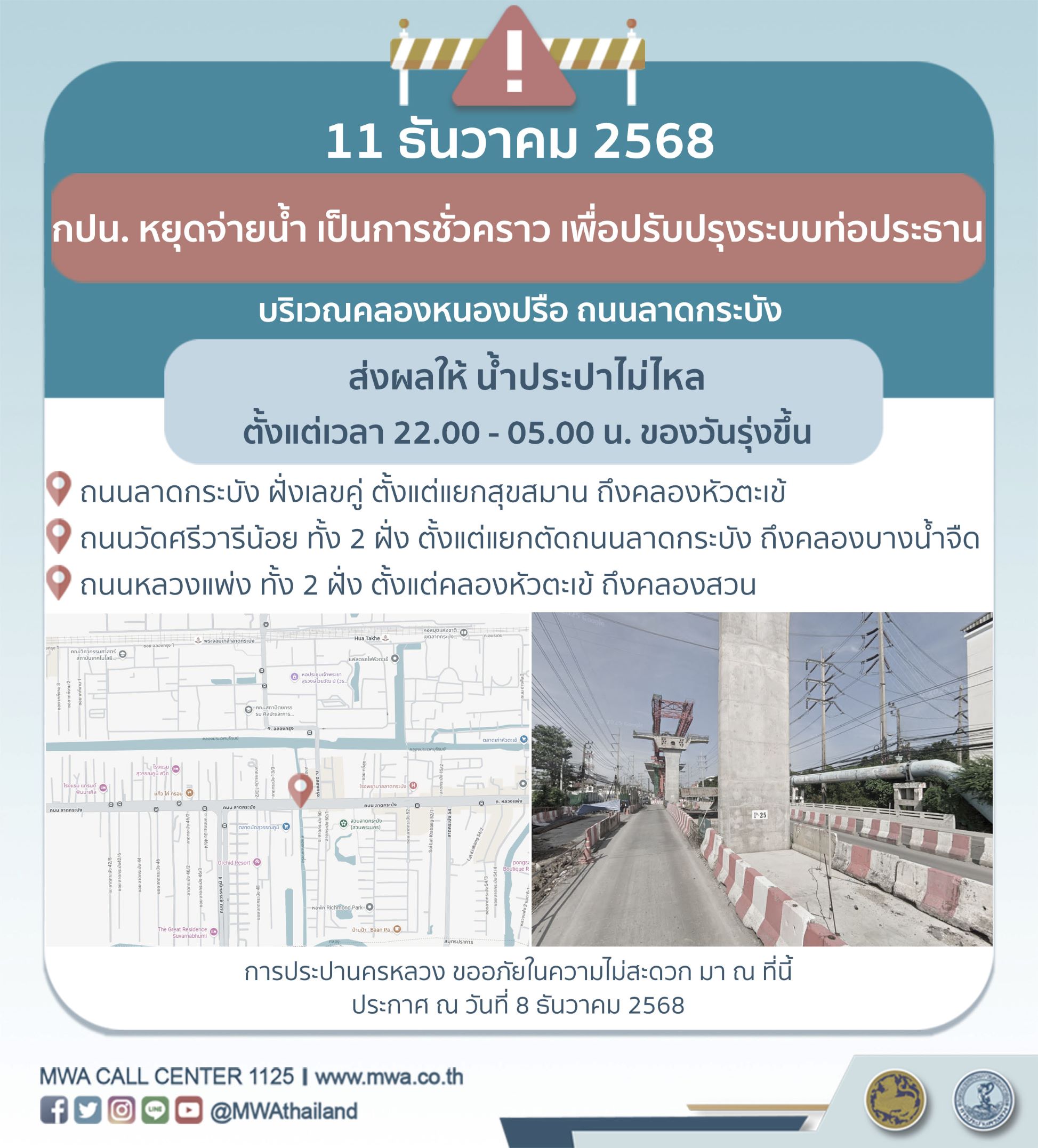 การประปานครหลวง (กปน.) ขอแจ้งให้ทราบว่า จะดำเนินการปรับปรุงระบบท่อประธาน ในพื้นที่บริเวณคลองหนองปรือ ถนนลาดกระบัง เพื่อให้ประชาชนได้รับบริการน้ำประปาอย่างเพียงพอและทั่วถึง จึงมีความจำเป็นต้องหยุดจ่ายน้ำ เป็นการชั่วคราว ในคืนวันพฤหัสบดีที่ 11 ธันวาคม 2568 ตั้งแต่เวลา 22.00 - 05.00 น. ของวันรุ่งขึ้น โดยระหว่างดำเนินการ ส่งผลให้ น้ำประปาไม่ไหล ในพื้นที่ดังต่อไปนี้