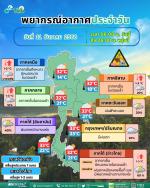 กรมอุตุนิยมวิทยา พยากรณ์อากาศ 24 ชั่วโมงข้างหน้า วันที่ 11 ธันวาคม 2568 ประเทศไทยตอนบนมีอุณหภูมิสูงขึ้นกับมีอากาศเย็นและมีหมอกบางในตอนเช้า โดยบริเวณภาคตะวันออกเฉียงเหนือตอนล่าง ภาคตะวันออก ภาคกลางตอนล่าง รวมทั้งกรุงเทพมหานครและปริมณฑล จะมีฝนเกิดขึ้นได้บางพื้นที่ ขอให้ประชาชนดูแลรักษาสุขภาพเนื่องจากสภาพอากาศที่เปลี่ยนแปลง และเพิ่มความระมัดระวังในการสัญจรผ่านบริเวณที่มีหมอก เกษตรกรควรเตรียมการป้องกันและระวังความเสียหายที่จะเกิดต่อผลลิตทางการเกษตรไว้ด้วย ทั้งนี้เนื่องจากบริเวณความกดอากาศสูงหรือมวลอากาศเย็นที่ปกคลุมประเทศไทยตอนบนและทะเลจีนใต้มีกำลังอ่อนลง ในขณะที่มีลมตะวันออกเฉียงใต้พัดเข้ามาปกคลุมบริเวณภาคตะวันออกเฉียงเหนือตอนล่าง และอ่าวไทยตอนบน