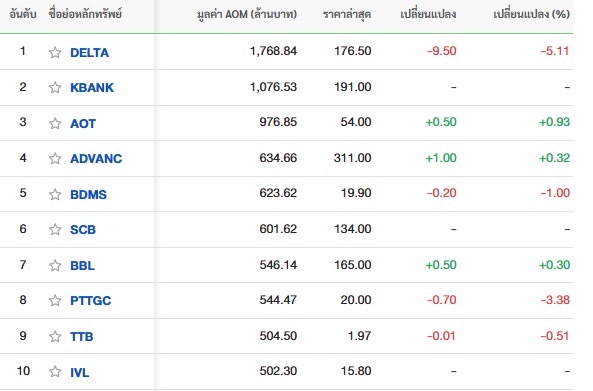 10 อันดับหลักทรัพย์ที่มีมูลค่าการซื้อขายสูงสุด
